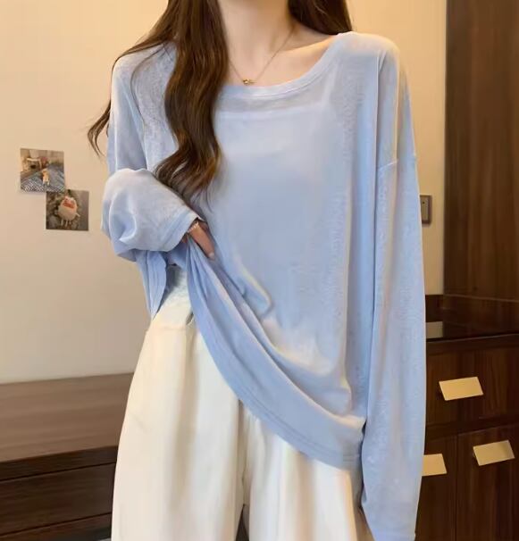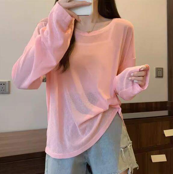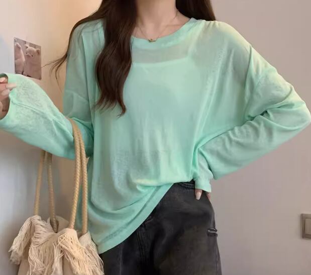 レディース トップス カットソー ニット プルオーバー Tシャツ ミドル丈 長袖 ドロップショルダー ラウンドネック フェミニン 透け感 薄手 かわいい 大人可愛い きれいめ シンプル カジュアル 上品 おしゃれ ラフ ボーイッシュ ガーリー ルーズ 抜け感 無地 夏 デート お出かけ 体型カバー 普段使い 着回し トレンド 流行 日焼け防止 日焼け対策 ゆったり ゆる フリーサイズ 大きめ オーバーサイズ ホワイト ピンク ブルー グリーン