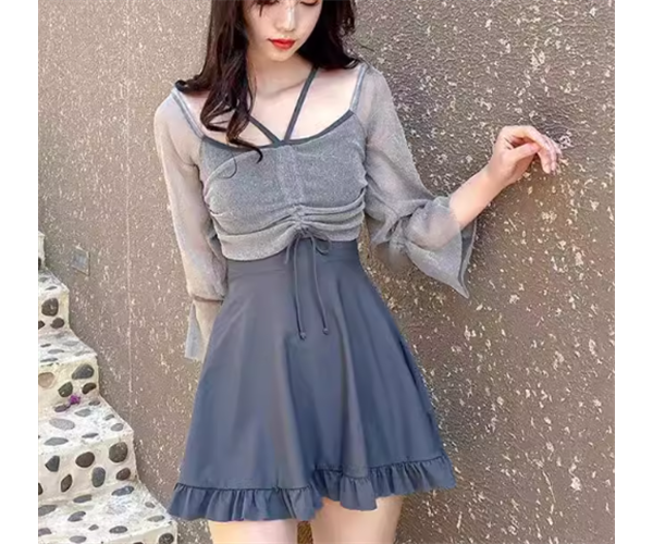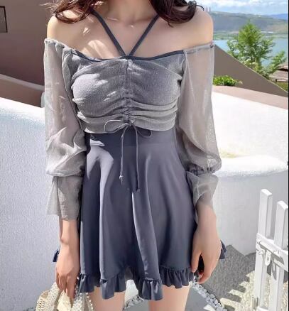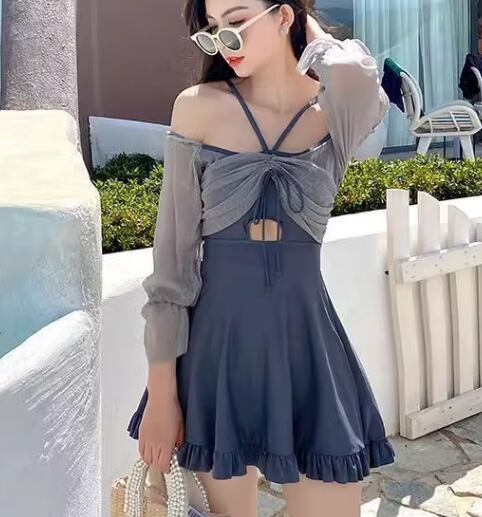 水着 レディース ワンピース 体型カバー スカートスタイル オフショル ノンワイヤー パッド付き 二の腕カバー 長袖 リボン フリル ハイウエスト かわいい 大人可愛い きれいめ シンプル カジュアル 大人っぽい おしゃれ お洒落 キュート ガーリー フェミニン シック 抜け感 無地 リゾート 旅行 温泉 プール 夏 海 着痩せ スタイルカバー お腹カバー 日焼け防止 日焼け対策 S M L XL Aカップ Bカップ Cカップ ブルー
