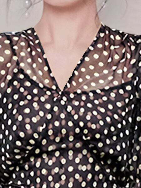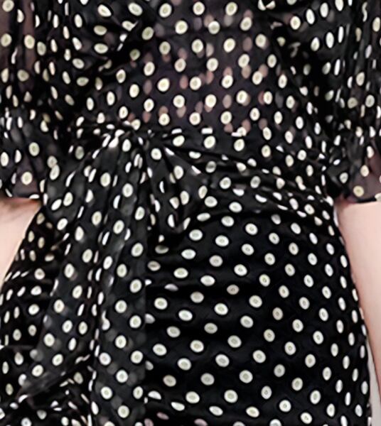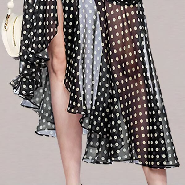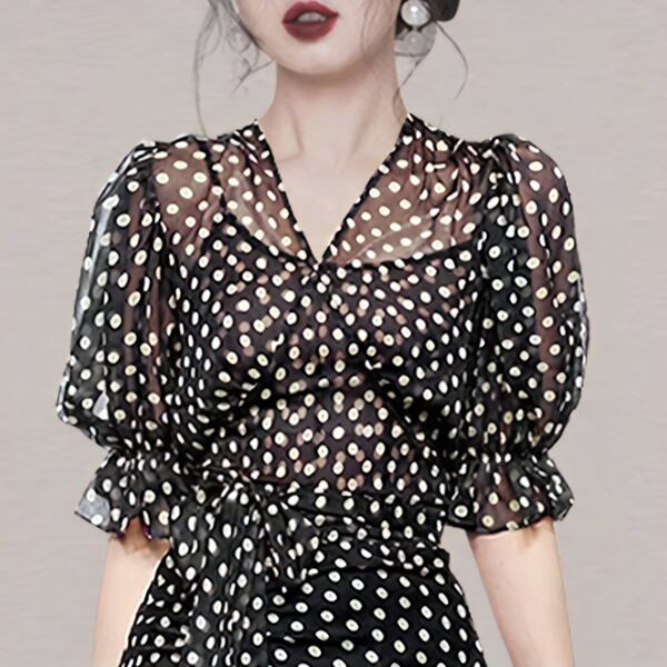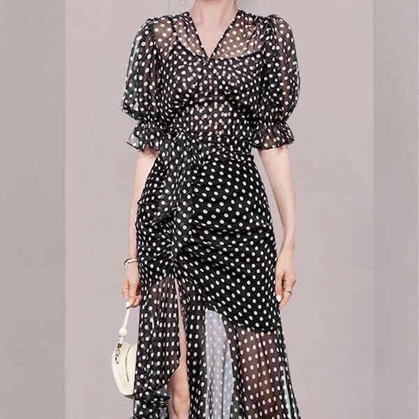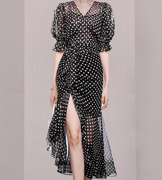 フィッシュテールシルエットのシフォンドレス。パフスリーブがエレガントな印象を与え、ハイスリットがセクシーさを演出。薄手の素材で涼しく、水玉模様が可愛らしいポイント。痩身効果も期待できる一着です。