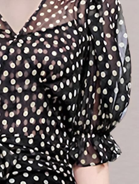 フィッシュテールシフォンドレス レディース ワンピース ドレス ミモレ ハーフ イレギュラー 半袖 パフスリーブ バルーン袖 Vネック 襟なし ノーカラー 細身 ストレート アシンメトリー フィッシュテール フェミニン シフォン スリット サイドスリット ファスナー ハイウエスト 前開き 薄手 大人可愛い 上品 おしゃれ レトロ エレガント フォーマル キュート セクシー ドット柄 水玉 春 夏 秋 20代 30代 パーティー イベント レストラン ホテル コンサート コンパ 着瘦せ 黒