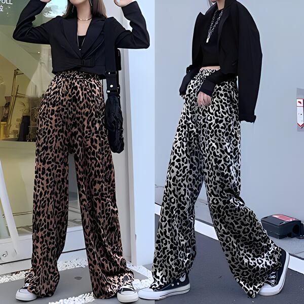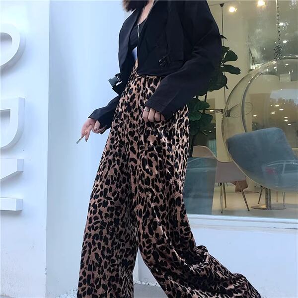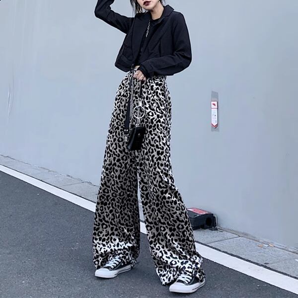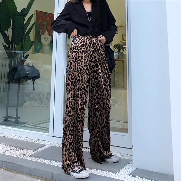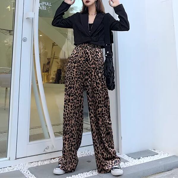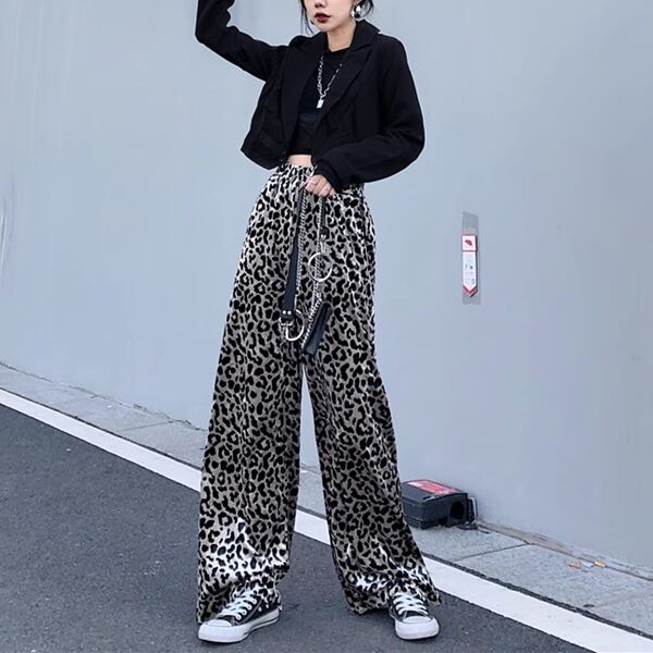 ストリートスタイルにぴったりのヒョウ柄ハイウエストワイドレッグパンツ。ドレープ感があり、レトロな雰囲気も漂う。ルーズなシルエットで、ダッドパンツとしても人気。おしゃれなフロアモップスタイルです。