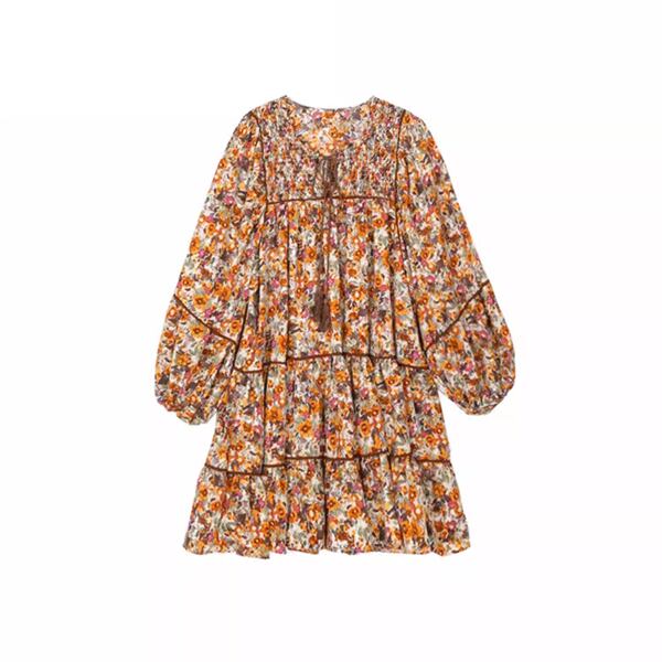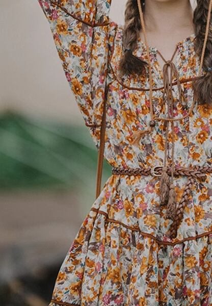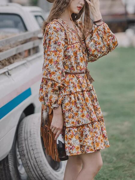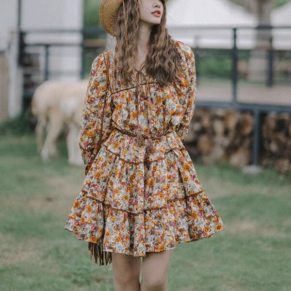 リゾート風のボヘミアンな花柄ワンピース。長袖のランタンスリーブがエレガントな印象を与え、Aラインのシルエットでスリムなラインを演出。フリンジ付きのショートスカートがボヘミアンな雰囲気を盛り上げます。リゾートやビーチなど、夏の特別な場面にぴったりの一着です。