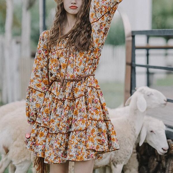 ボヘミアンランタンスリーブスリムドレス レディース スカート トップス ワンピース アウター ミニ 膝上 長袖 バルーン袖 ランタンスリーブ スクエアネック 襟なし ノーカラー ワイド Aライン バルーン フェミニン シフォン ボヘミアン ふわふわ ふっくら ハイウエスト バイカラー フリンジ タッセル かわいい カジュアル 上品 おしゃれ ガーリー モード系 エレガント キュート プリント 小花柄 春 夏 秋 10代 20代 パーティー イベント レストラン コンパ カフェ 着瘦せ お腹カバー