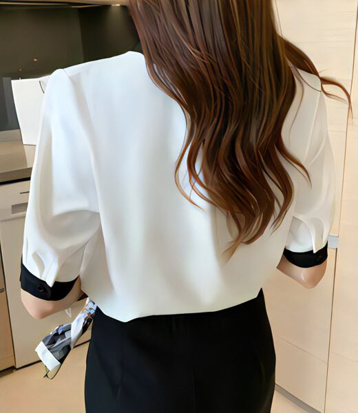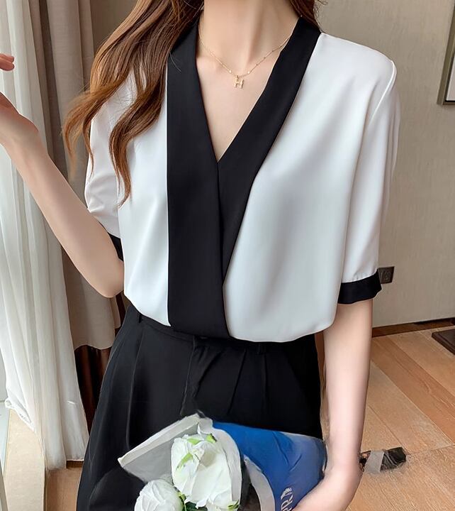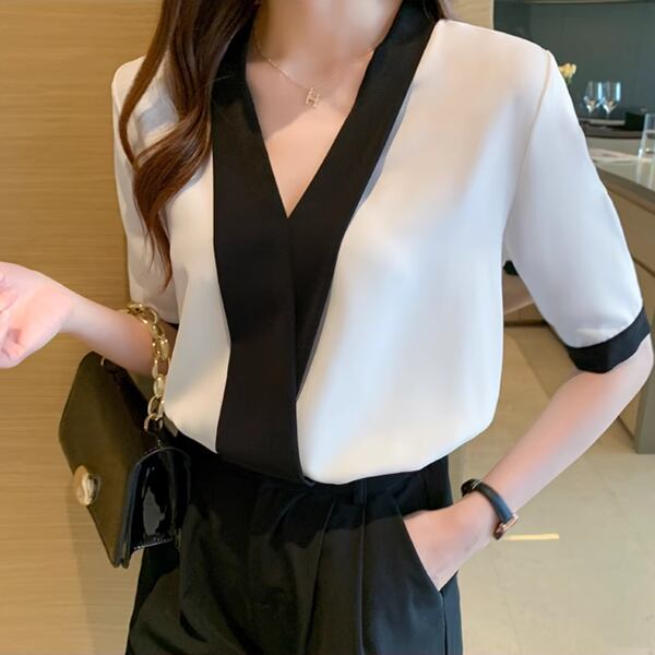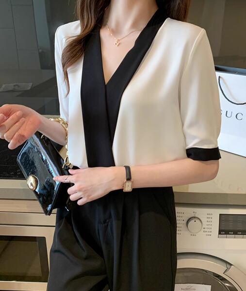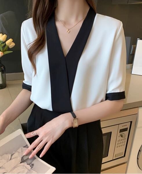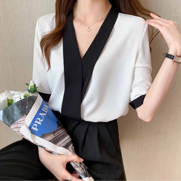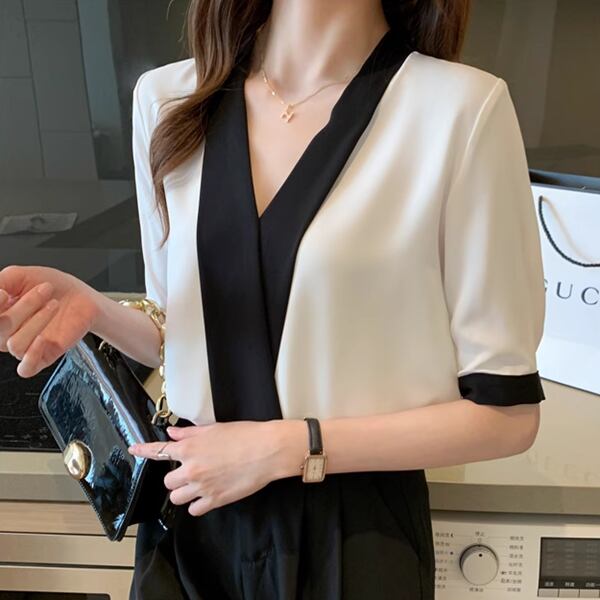 夏に最適なシフォン素材の半袖Vネックシャツ。作業服としても活躍し、ルーズながらも痩身効果を発揮。5分袖で涼しさをキープし、快適な着心地を提供します。
