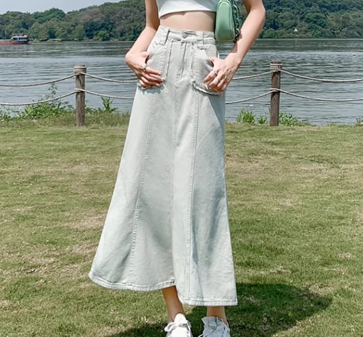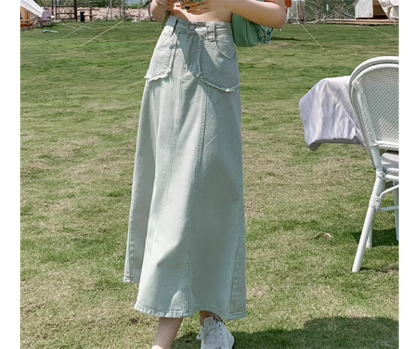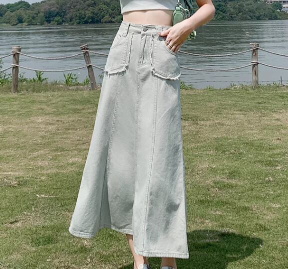 レディース スカート デニムスカート ロングスカート ロング フレア Aライン フェミニン ポケット ハイウエスト デニム カラーデニム かわいい 大人可愛い きれいめ シンプル カジュアル 上品 おしゃれ レトロ ガーリー エレガント キュート ラグジュアリー 無地 夏 デート お出かけ 脚長 普段使い 着回し XS S M L XL 小さいサイズ 大きいサイズ パステル くすみ アプリコット グリーン