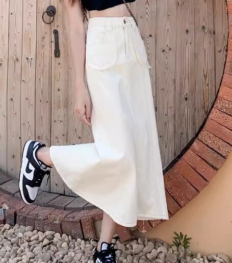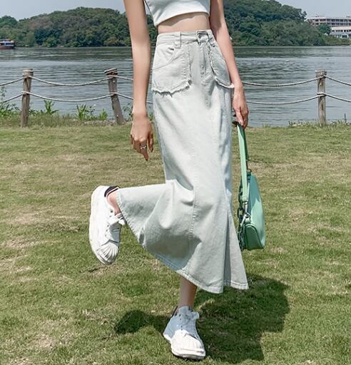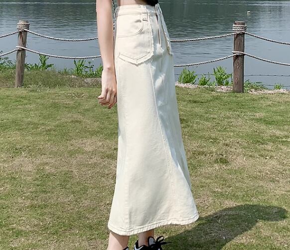 上品で落ち着いた色味が大人可愛いロング丈のデニムスカート。