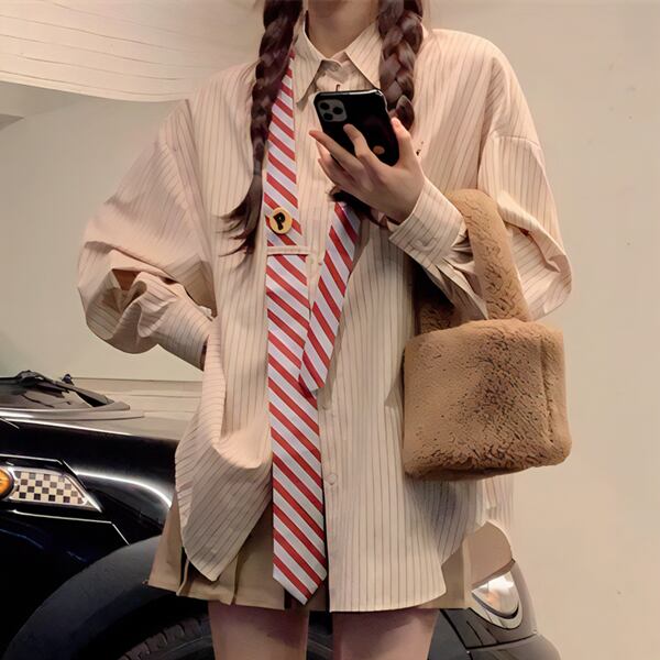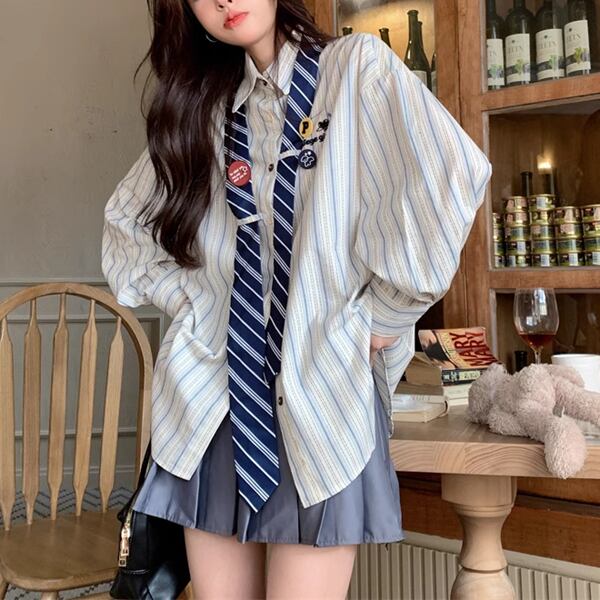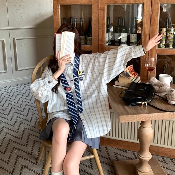 2色展開“College girl”長袖シャツ&ネクタイ レディース トップス ジャケット シャツ ブラウス アウター 長袖 ポロカラー ネクタイ付き ストレート 刺繍 ボタン バイカラー かわいい 大人可愛い カジュアル おしゃれ レトロ エキゾチック ルーズ キュート カレッジ風 学生風 爽やか ポップ ストライプ ステッチ ロゴ 立体模様 立体装飾 パッチワーク 春 秋 10代 20代 通勤 通学 アウトドア イベント ガーデン ライブ カフェ ツーリング