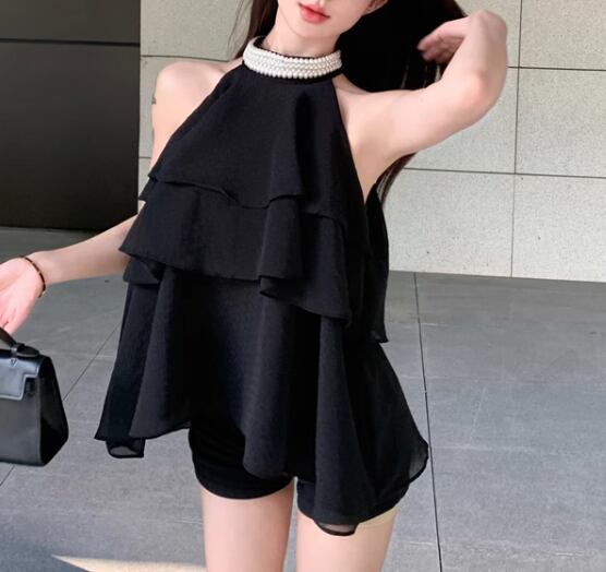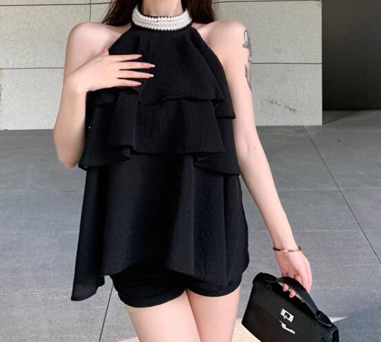 レディース トップス シャツ カットソー プルオーバー ショート クロップド丈 袖なし ノースリーブ ホルターネック フェミニン シフォン フリル かわいい 大人可愛い きれいめ シンプル カジュアル おしゃれ ガーリー エレガント 存在感 キュート ラグジュアリー 豪華 セレブリティ シック 高級感 華やか 優しい 穏やか フェアリー 無地 夏 デート お出かけ 普段使い S M L ブラック アプリコット