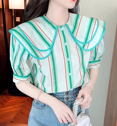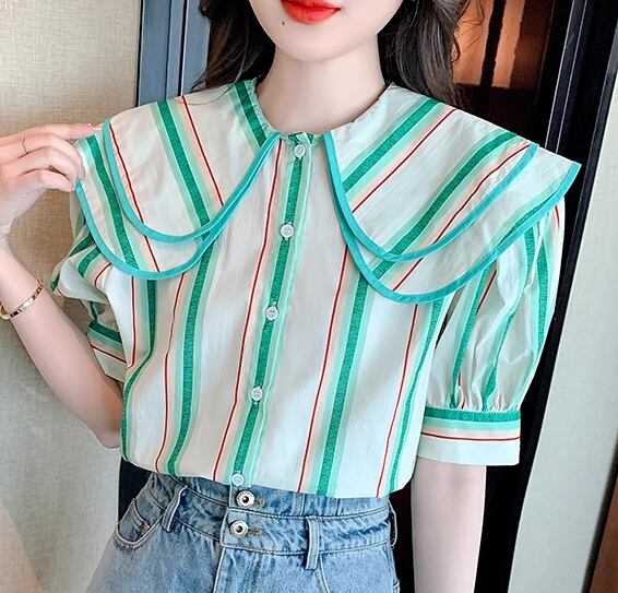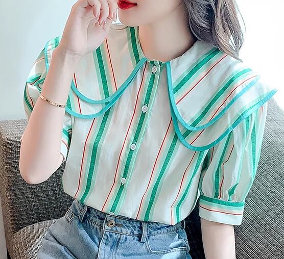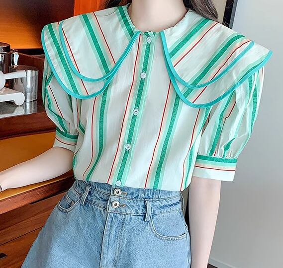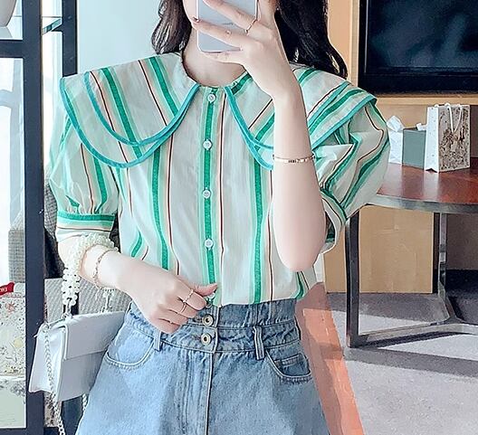 レディース トップス シャツ ミドル丈 半袖 パフスリーブ 襟付き ビッグカラー フェミニン 前開き ボタン かわいい 大人可愛い きれいめ カジュアル 上品 おしゃれ レトロ ガーリー ルーズ キュート ナチュラル 清潔感 シック 高級感 優しい 穏やか ストライプ 夏 デート お出かけ 旅行 レストラン 女子会 休日 体型カバー 普段使い 着回し 清楚 S M L ゆったり グリーン カラフル
