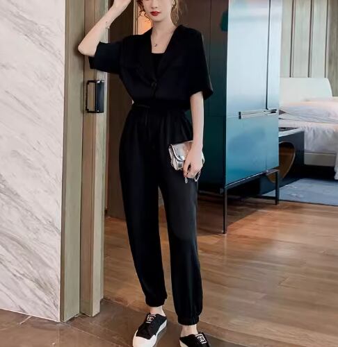 二点セット 上下セット ツーピース レディース ジャケット パンツ スーツ セットアップ フルレングス 半袖 襟付き スーツカラー フェミニン ウエストゴム 異国風 かわいい 大人可愛い きれいめ シンプル カジュアル おしゃれ かっこいい レトロ こなれ感 ラフ ボーイッシュ ルーズ クール エレガント 無地 夏 デート お出かけ 体型カバー 普段使い 着回し S M L ゆったり ブラック パープル