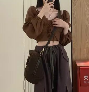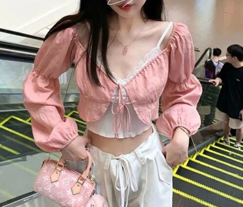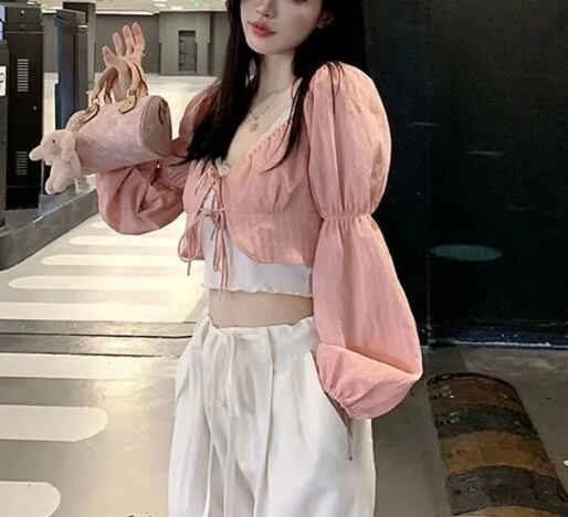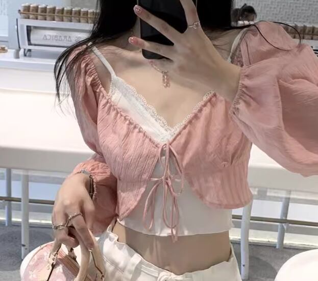 クロップド丈のキャミソールと中央のリボンが可愛い長袖トップスの二点セットです。