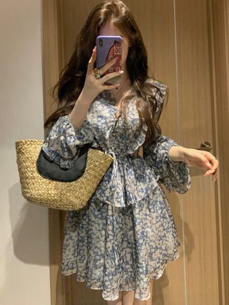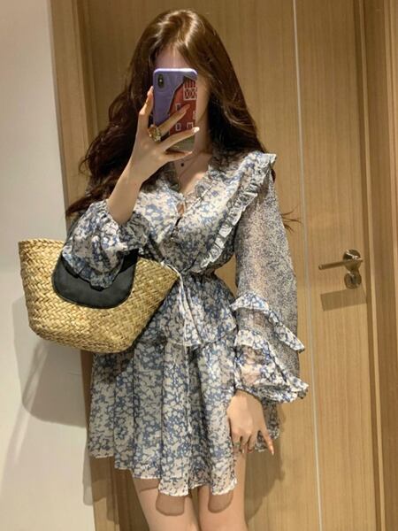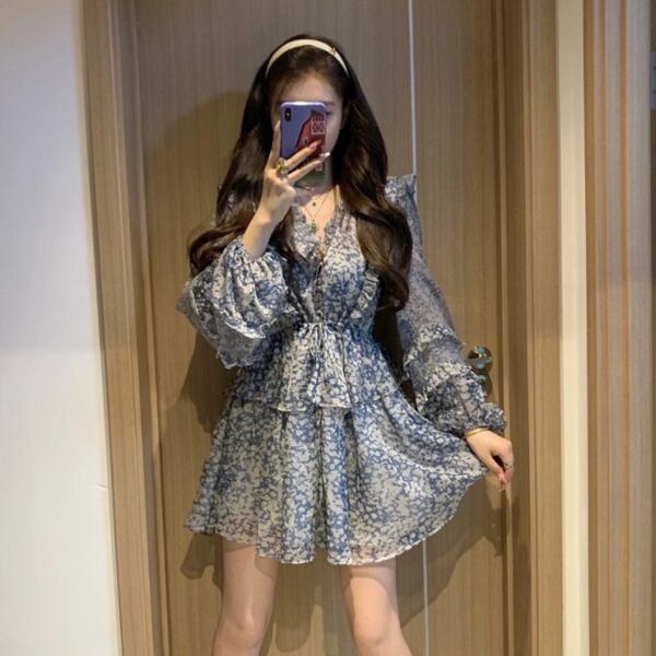 ティーブレイクフレンチブルーの花柄ドレス レディース ワンピース ドレス ミニ 膝上 長袖 パフスリーブ Vネック Aライン プリーツ レース フリル ハイウエスト かわいい カジュアル 上品 おしゃれ ガーリー ルーズ エレガント ロリータ 涼しげ 花柄 プリント 夏 秋 10代 20代 お出かけ パーティー イベント レストラン ショッピング コンサート フェス モテ
