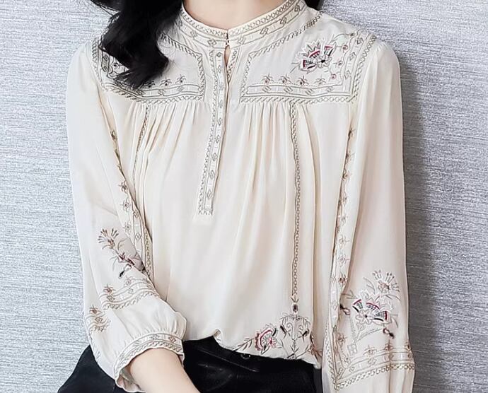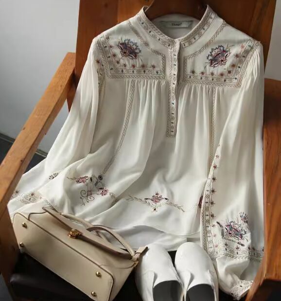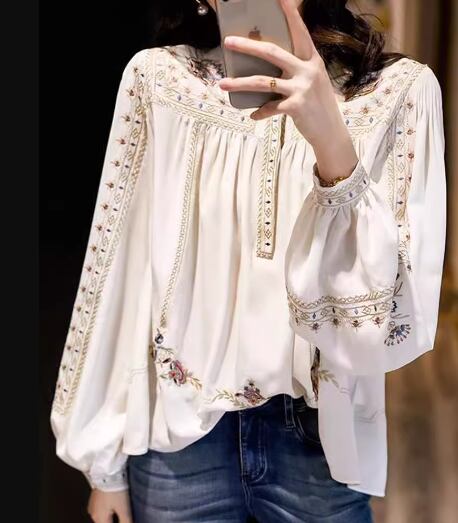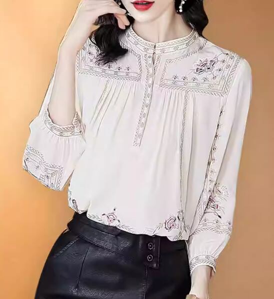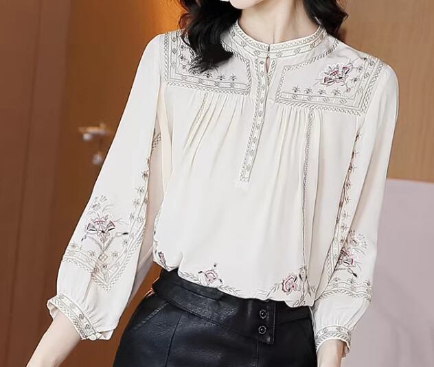 ウエスタン調のレトロな模様が大人可愛い長袖のシフォンシャツ。