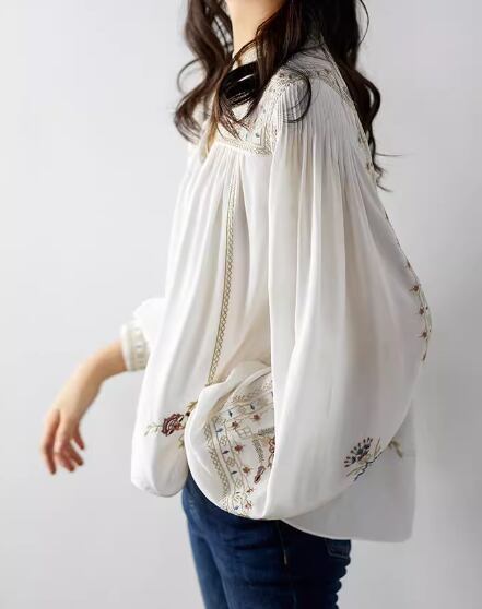 レディース トップス シャツ プルオーバー ミドル丈 長袖 ボリューム袖 バルーン袖 ランタンスリーブ スタンドカラー フェミニン ウエスタン シフォン かわいい 大人可愛い きれいめ カジュアル 上品 おしゃれ かっこいい レトロ 個性的 クール エレガント キュート ラグジュアリー ナチュラル プリント 春 秋 デート お出かけ 体型カバー 普段使い 着回し M L XL 大きいサイズ ゆったり ホワイト