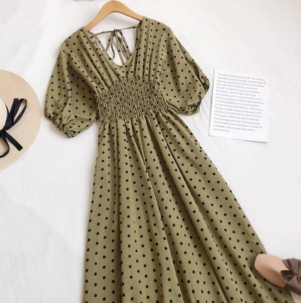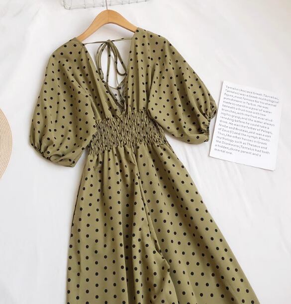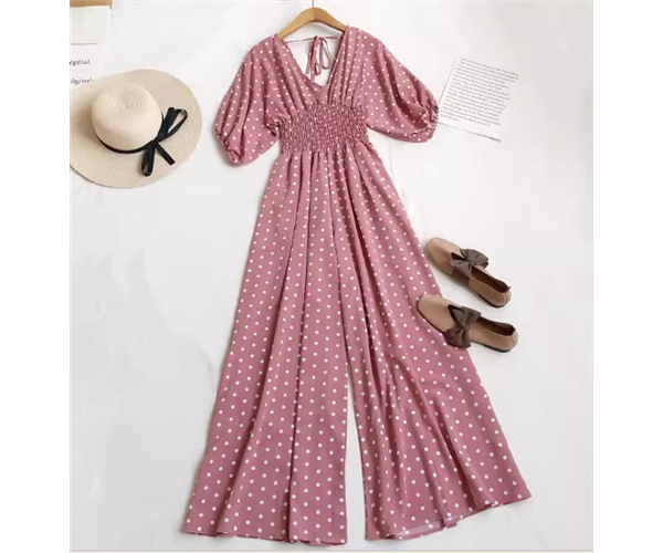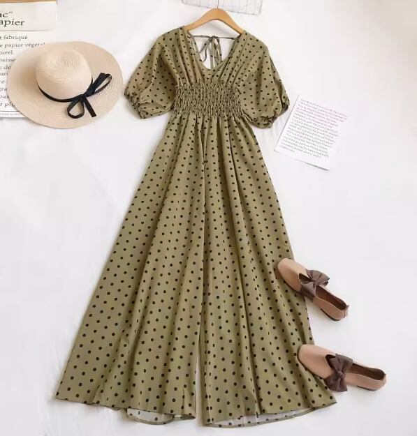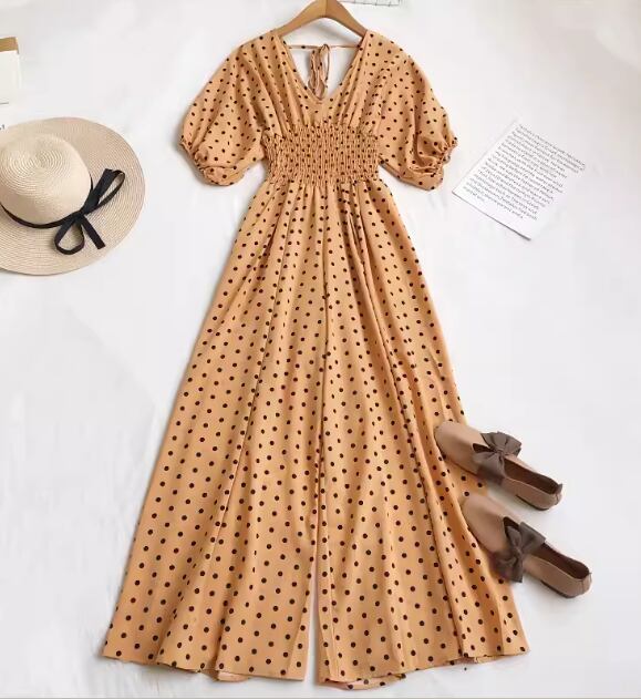 レディース パンツ オールインワン フルレングス 半袖 パフスリーブ Vネック ワイド フェミニン バックリボン ハイウエスト ウエストゴム ストレッチ 伸縮性 かわいい 大人可愛い シンプル カジュアル 上品 おしゃれ レトロ こなれ感 ガーリー 個性的 存在感 キュート ラグジュアリー ドット柄 水玉 春 夏 デート お出かけ 体型カバー 脚長 普段使い ゆったり フリーサイズ ブラック イエロー ピンク アプリコット グリーン