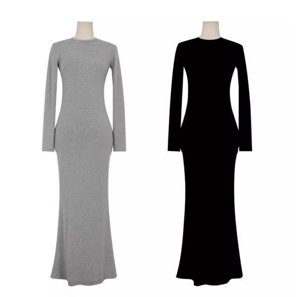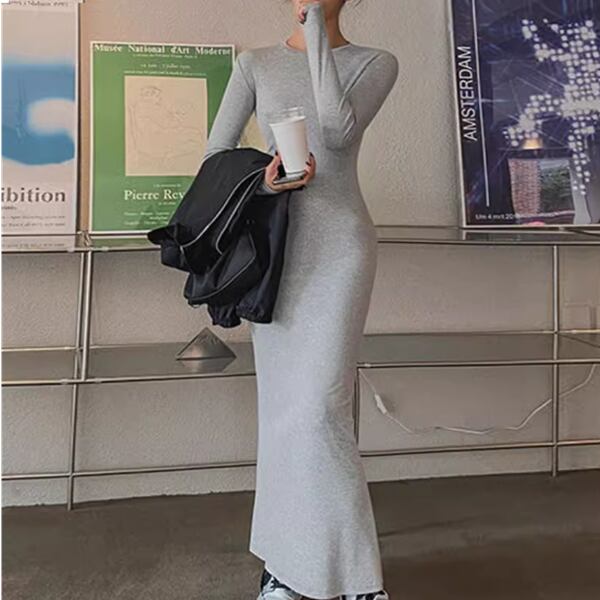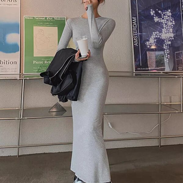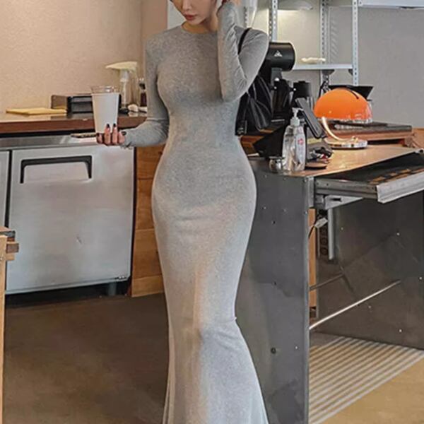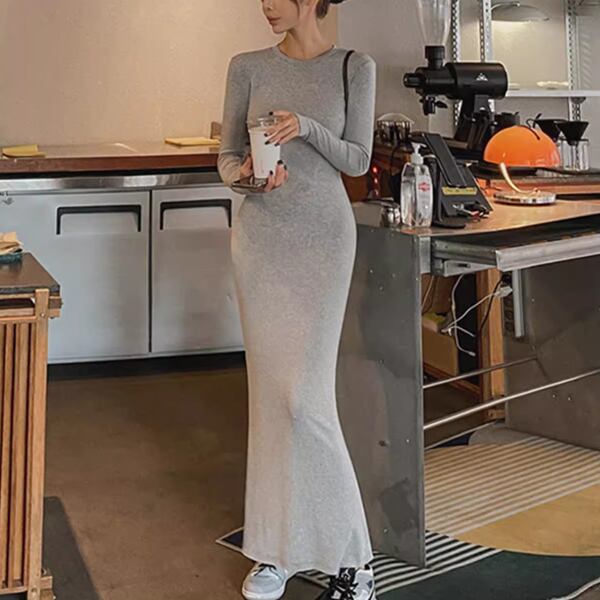 シックなデザインのロングドレス。ラウンドネックと長袖がエレガント。スリムフィットで体型を美しく引き立て、ヒップパッキングのシルエットが女性らしさを演出。フィッシュテールスカートの魅力満載です。ショッピング、ディナーからパーティ、コンパ等々・・・街歩きはもちろん、特別な場所に参加するのにも最適の一着です。
