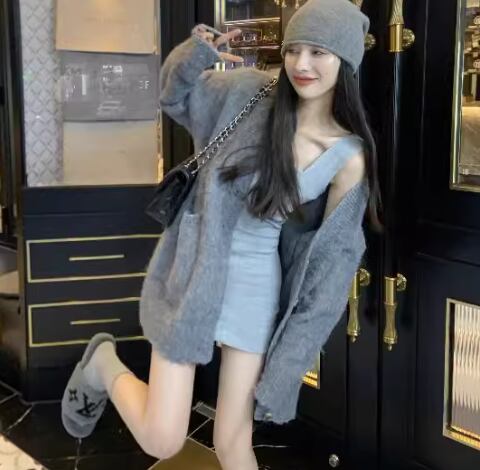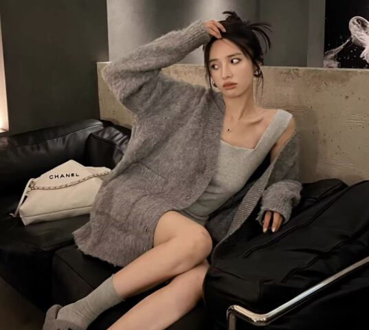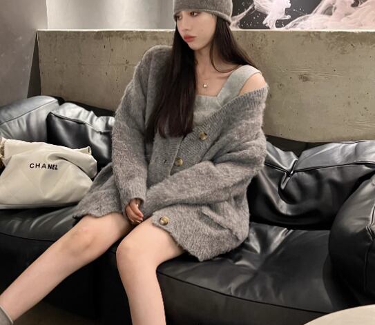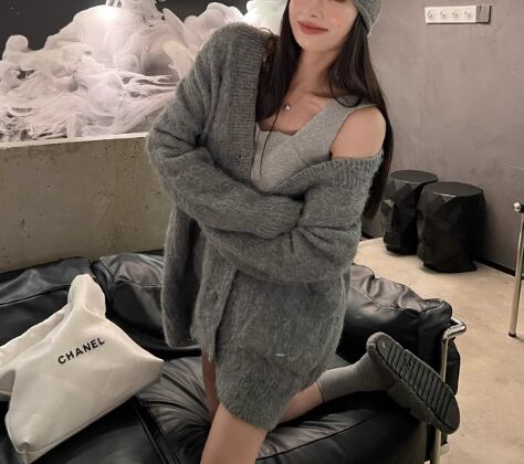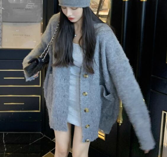 ゆるだぼなオーバーサイズと落ち着いたグレーの色味が魅力的なミドル丈の長袖ニットカーディガン。