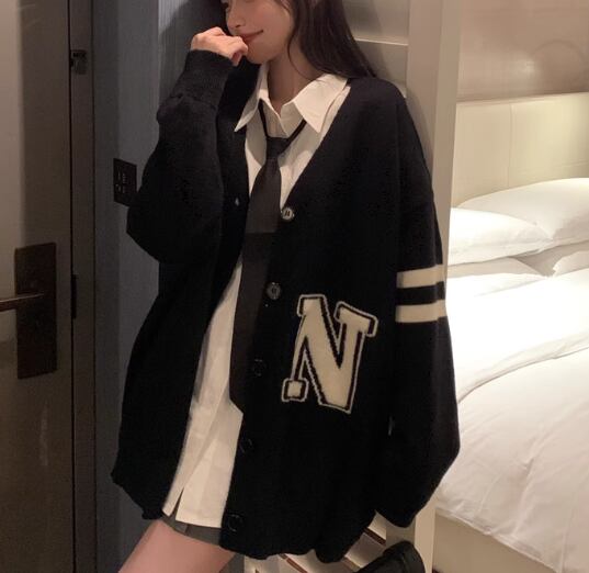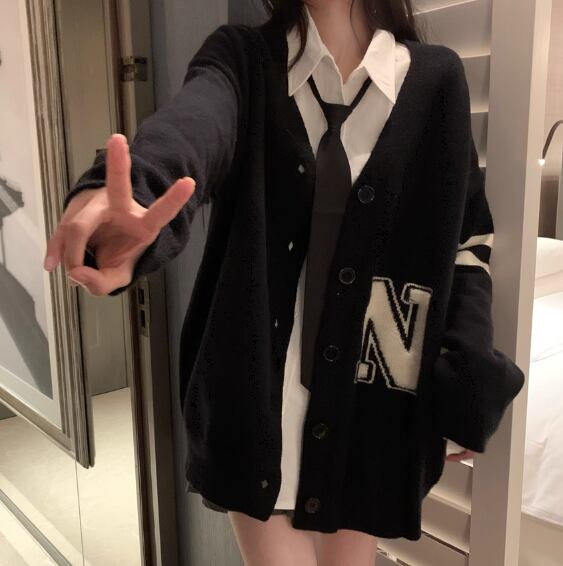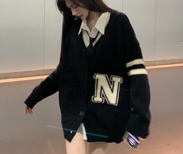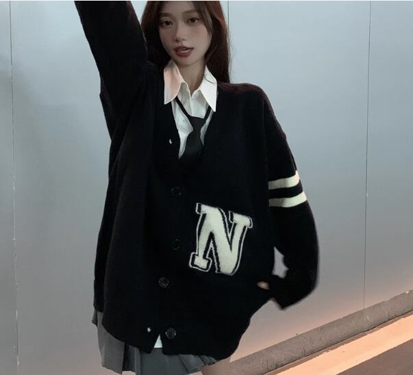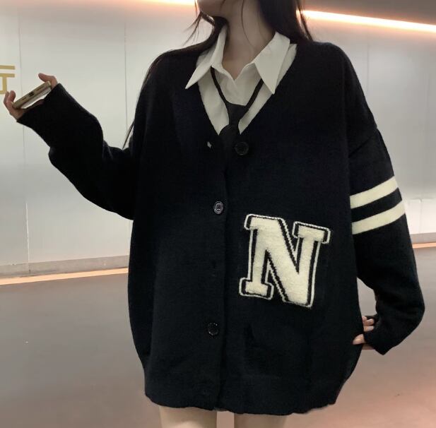 レディース ニット カーディガン 羽織 前開き ミドル丈 長袖 Vネック ストレート 異国風 ボタン かわいい 大人可愛い カジュアル おしゃれ かっこいい レトロ ボーイッシュ ルーズ クール エレガント キュート ラグジュアリー カレッジ風 学生風 文字 テキスト 英語 秋 冬 10代 20代 学生 学校 通学 デート お出かけ 韓国 体型カバー 普段使い 着回し S M L XL 大きいサイズ ゆったり ブラック