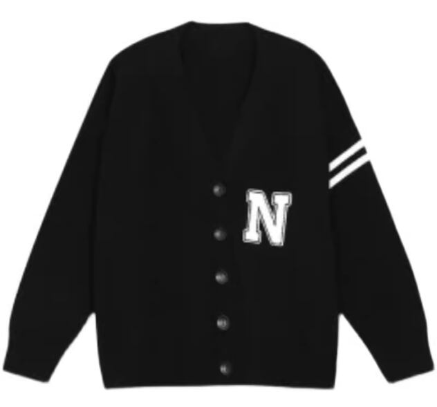 大きめのNの文字と英国風のデザインが魅力的なゆったりサイズのニットカーディガン。