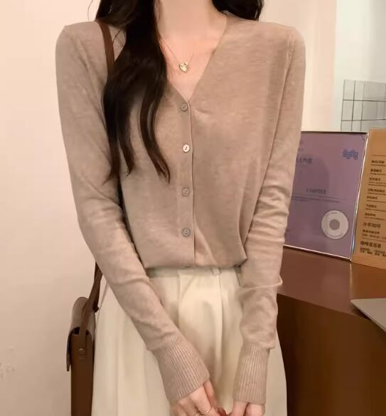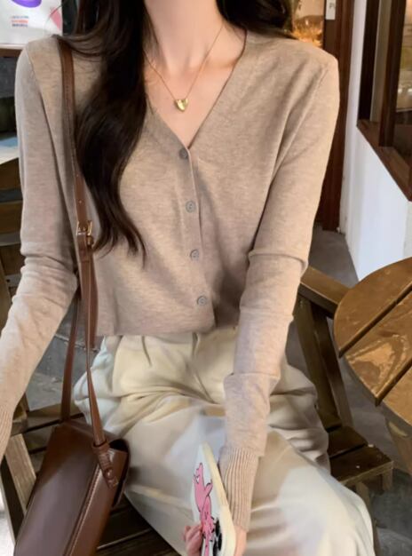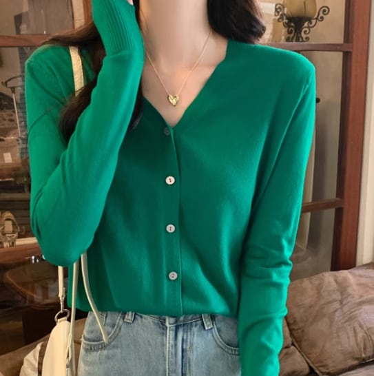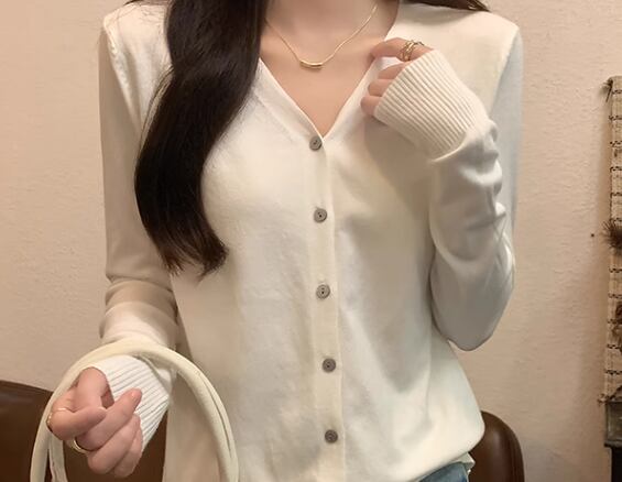 上品で落ち着いた色味とシンプルで洗練されたデザインが大人可愛い長袖のVネックニットカーディガン。