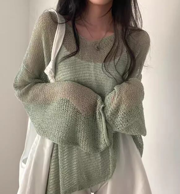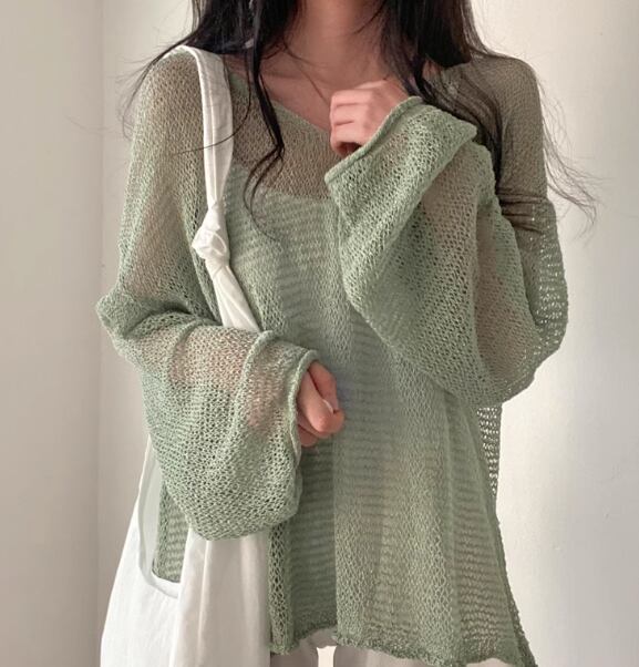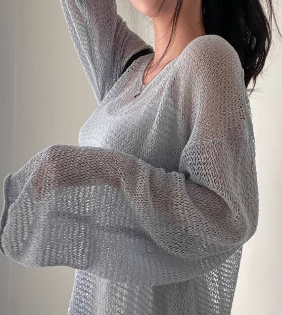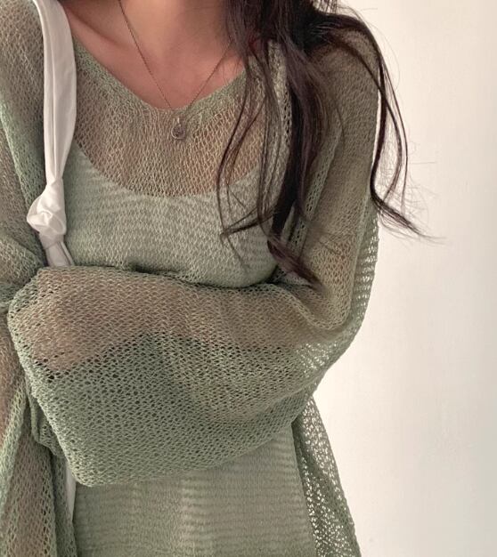 レディース トップス ニット セーター プルオーバー サマーニット ミドル丈 長袖 ドロップショルダー Vネック フェミニン 透け感 薄手 かわいい 大人可愛い きれいめ シンプル カジュアル おしゃれ こなれ感 ラフ ボーイッシュ ルーズ クール エレガント 抜け感 夏 デート お出かけ 重ね着 体型カバー 普段使い 着回し レイヤード 日焼け防止 日焼け対策 ゆったり ゆる フリーサイズ 大きめ グレー アプリコット グリーン