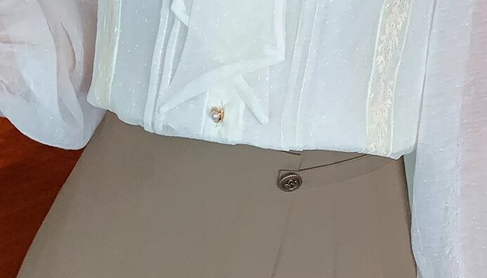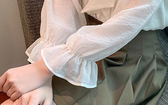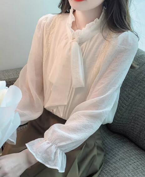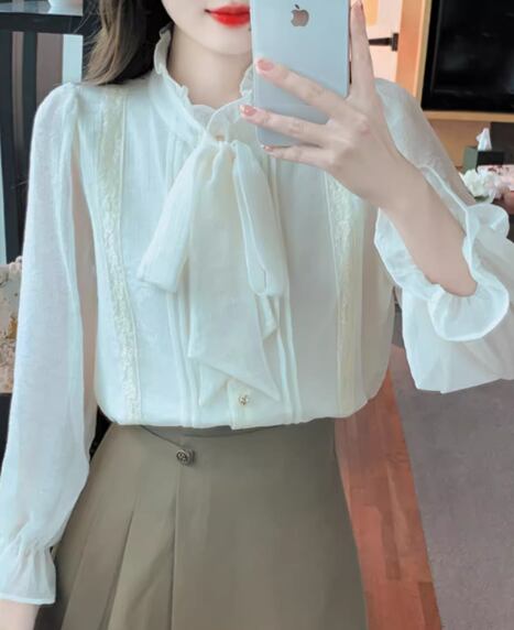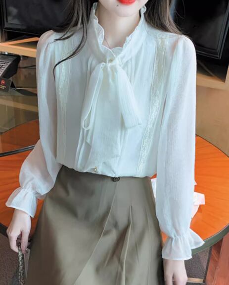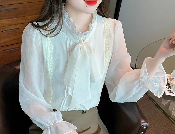 女性らしいフリルとりぼんタイが大人可愛い長袖のシフォンシャツ。