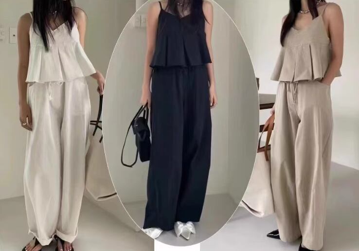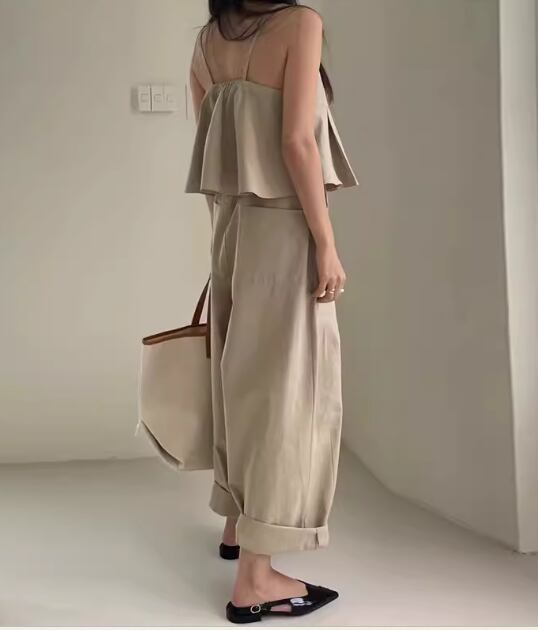 クロップド丈のキャミソールとフルレングスのワイドパンツの二点セットです。
