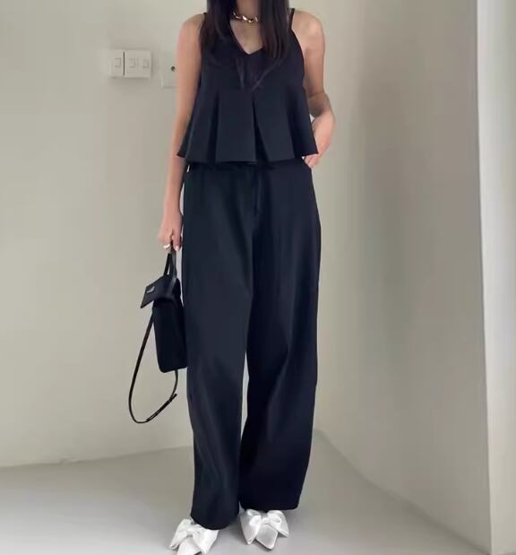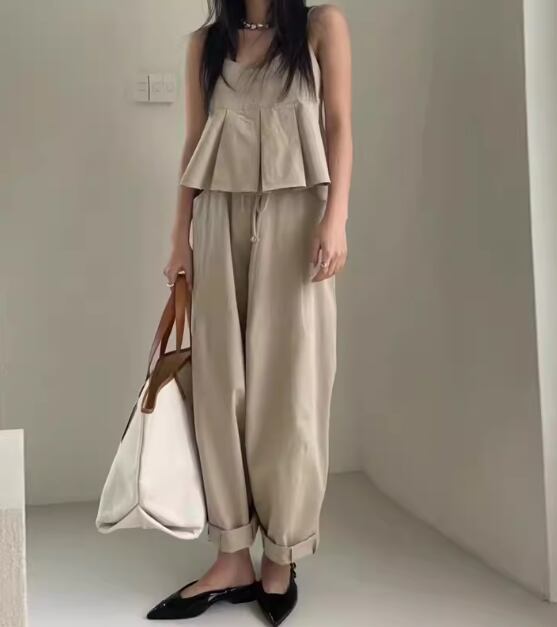 二点セット 上下セット ツーピース レディース トップス パンツ プルオーバー キャミソール セットアップ ワイドパンツ フルレングス 袖なし ノースリーブ Vネック ハイウエスト 異国風 かわいい 大人可愛い シンプル カジュアル おしゃれ かっこいい レトロ こなれ感 ラフ ボーイッシュ クール 抜け感 ラグジュアリー 無地 夏 デート お出かけ 韓国 普段使い 着回し フリーサイズ ホワイト ブラック カーキ