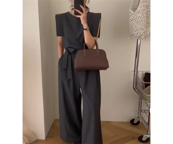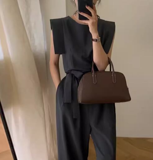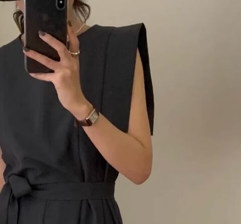 落ち着いたダークグレーとシンプルで洗練されたデザインが大人っぽくてかっこいいノースリーブのオールインワン。