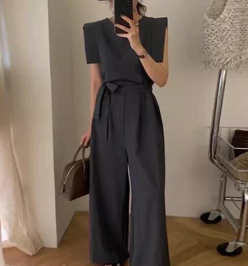 レディース パンツ オールインワン フルレングス 袖なし ノースリーブ ラウンドネック ワイド ストレート ウエストマーク ウエストリボン ハイウエスト 異国風 大人可愛い きれいめ シンプル カジュアル 上品 おしゃれ かっこいい こなれ感 ボーイッシュ ルーズ クール エレガント ラグジュアリー 無地 夏 デート お出かけ 韓国 体型カバー 脚長 普段使い ゆったり ゆる フリーサイズ 大きめ グレー