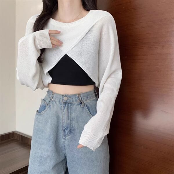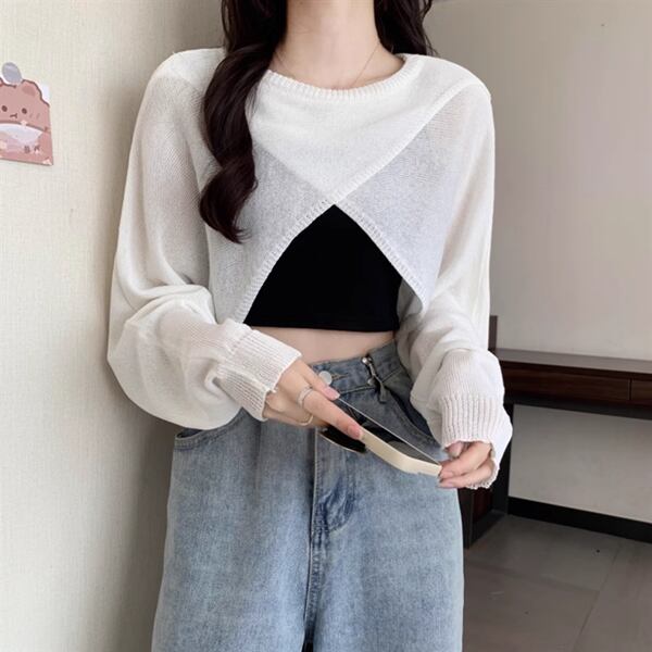 ニットのショートショール風ブラウス。そのままシャツとして、あるいはちょっとしたアウターとして、様々なコーデができるレイヤードスタイルに最適なアイテムです。日焼け対策もバッチリ。ファッションに機能性をプラスし、夏から秋にむけての装いを楽しめます。