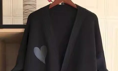 フリルたっぷりの袖と可愛らしいハートモチーフのボタンや模様が魅力的な長袖のVネックカーディガン。
