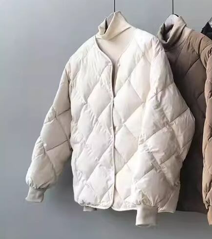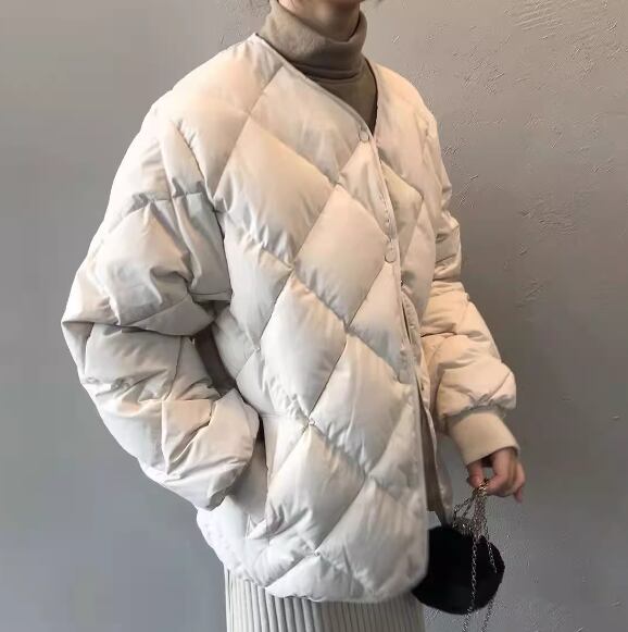 上品で落ち着いた色味が大人可愛いノーカラータイプのダウンコート。