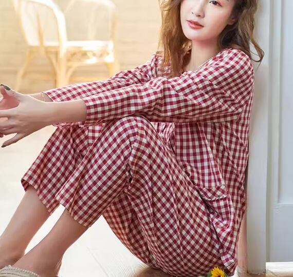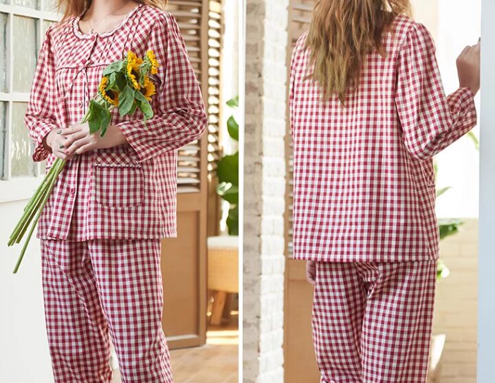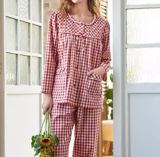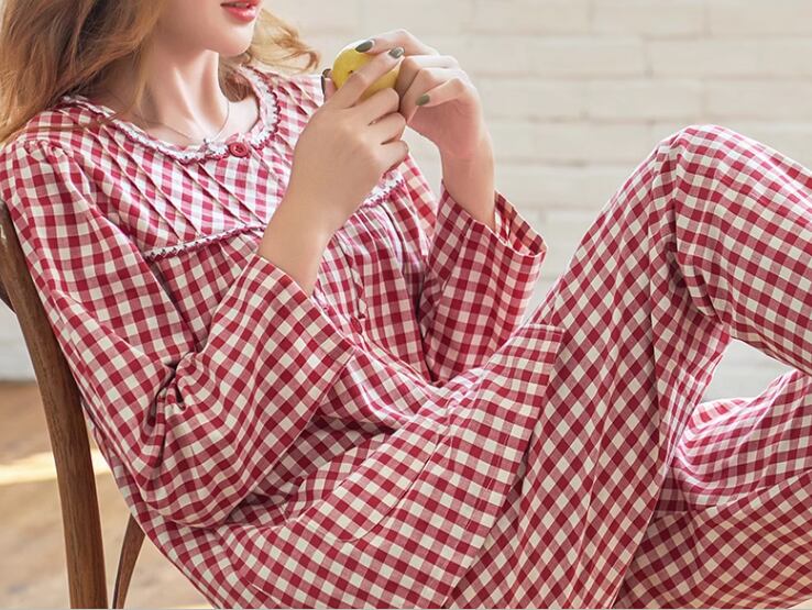 レッド×ホワイトの女性らしいチェック柄が魅力的な春秋用のパジャマ。