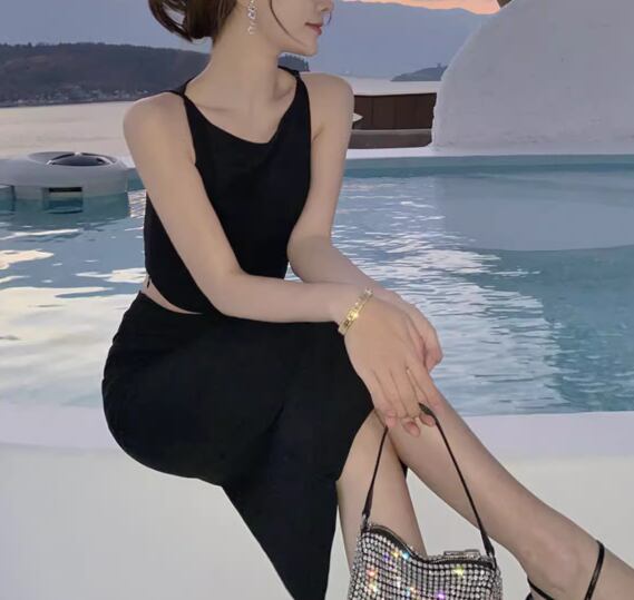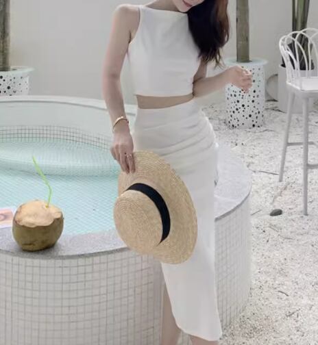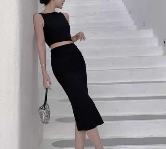 クロップド丈のノースリーブトップスとミモレ丈のタイトスカートの二点セットです。