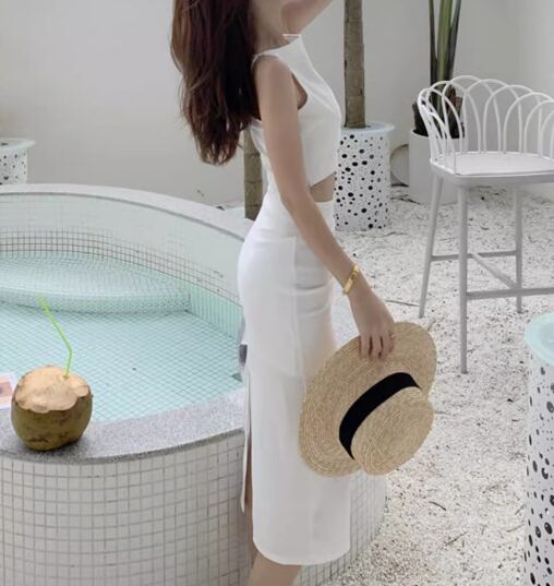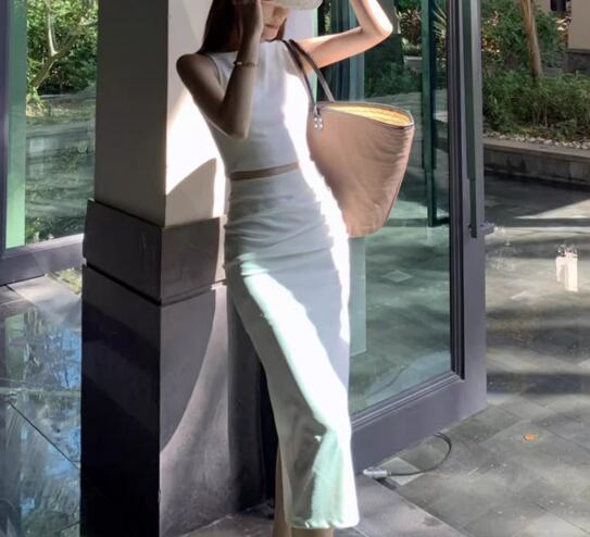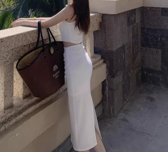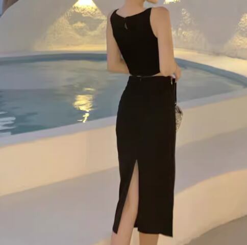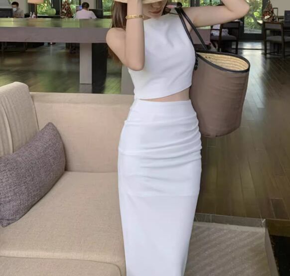 二点セット 上下セット ツーピース レディース スカート トップス プルオーバー セットアップ タイトスカート ロングスカート 袖なし ノースリーブ ラウンドネック タイト スリム 細身 フェミニン バックスリット ファスナー ハイウエスト かわいい 大人可愛い きれいめ シンプル カジュアル 上品 おしゃれ かっこいい こなれ感 無地 夏 デート お出かけ 普段使い 着回し S M L 小さめ フィット ホワイト ブラック