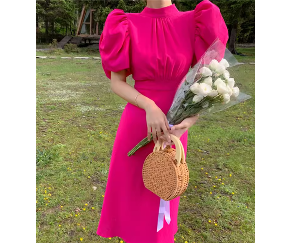 レディース ドレス ワンピース パーティードレス ウェディング パーティー 結婚式 二次会 披露宴 ミモレ ロング 半袖 パフスリーブ ハイネック スタンドカラー セミフレア ウエストマーク バックリボン ハイウエスト プルオーバー 背中開き 可愛い きれいめ 大人可愛い おしゃれ ガーリー エレガント 存在感 抜け感 無地 イベント ホテル レストラン デート 食事会 会食 高見え 夏 S M L レッド