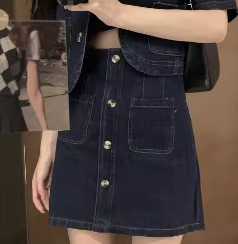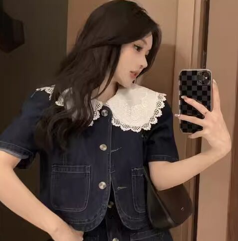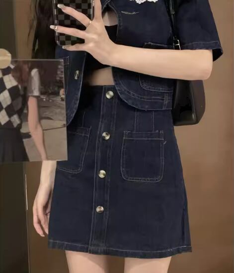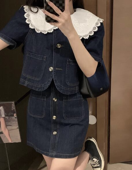 クロップド丈の半袖デニムシャツジャケットとショート丈のデニムスカートの二点セットです。
