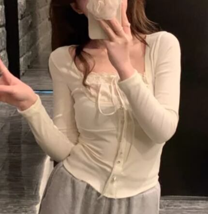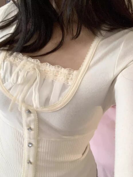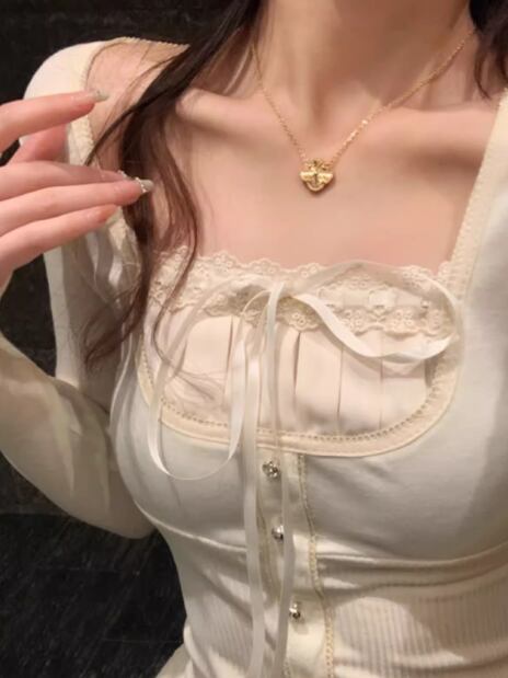レディース トップス カットソー プルオーバー Tシャツ ショート クロップド丈 長袖 スクエアネック タイト スリム 細身 フェミニン レース リボン ボタン かわいい 大人可愛い きれいめ シンプル カジュアル 上品 おしゃれ ガーリー エレガント ラブリー キュート ラグジュアリー 豪華 セクシー シック 高級感 無地 春 デート お出かけ 普段使い 着回し 清楚 フリーサイズ 小さめ フィット ホワイト