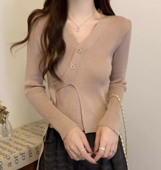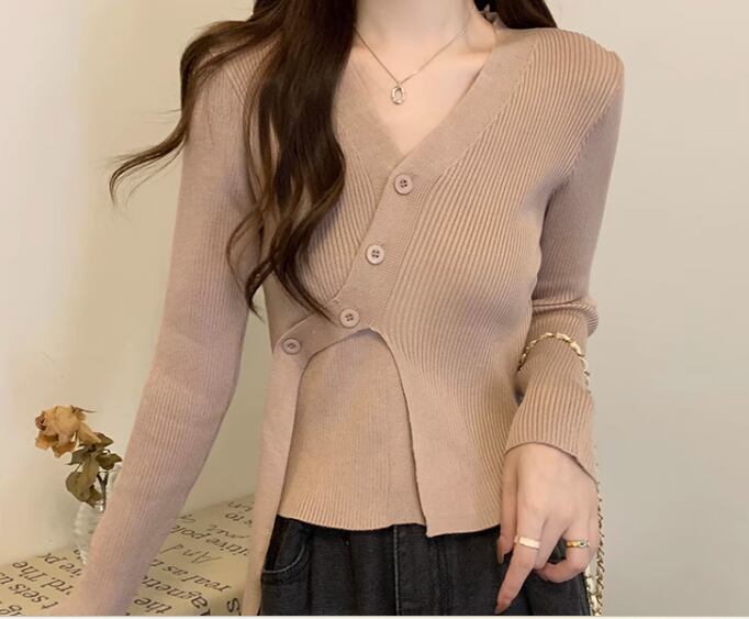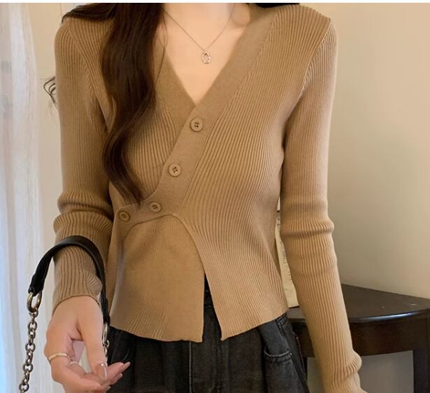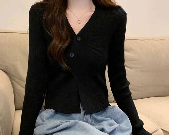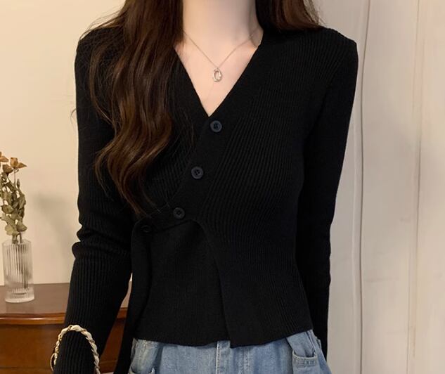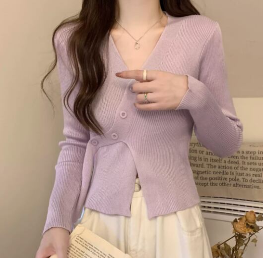 レディース トップス ニット セーター ショート アシンメトリー クロップド丈 左右非対称 長袖 Vネック タイト スリム 細身 スマート ボタン ストレッチ 伸縮性 かわいい 大人可愛い きれいめ シンプル カジュアル おしゃれ かっこいい ボーイッシュ 個性的 クール エレガント 無地 春 秋 デート お出かけ 普段使い 着回し フリーサイズ 小さめ フィット ホワイト ブラック ブラウン カーキ パープル