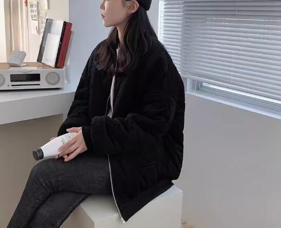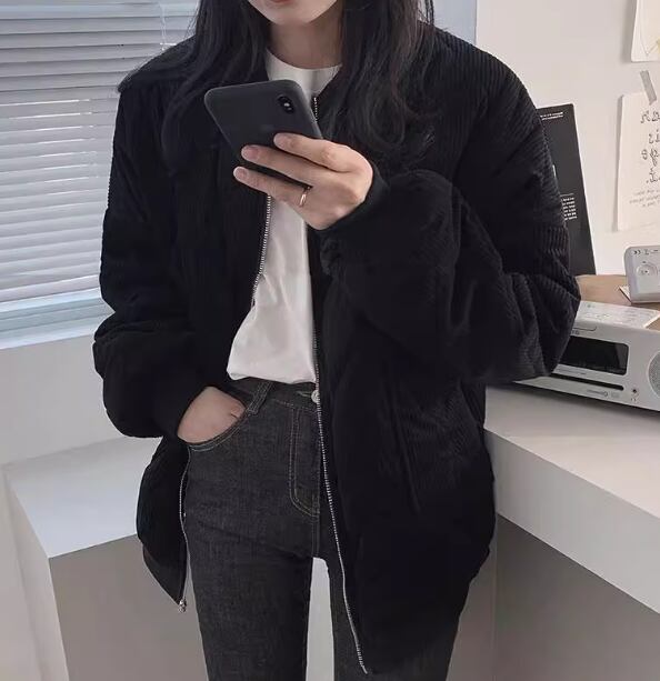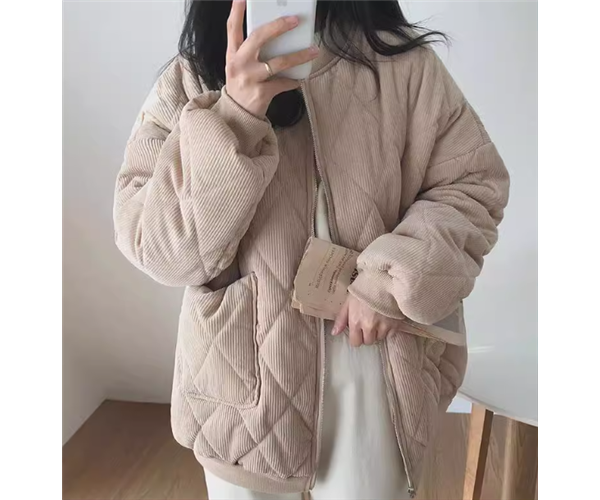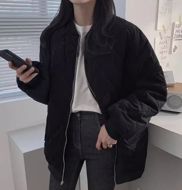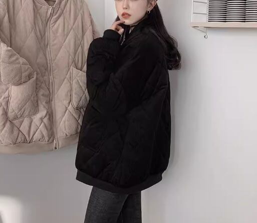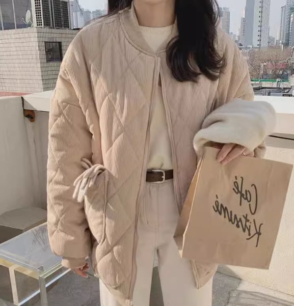 レディース コート アウター 上着 キルティングコート ミドル丈 長袖 スタンドカラー ファスナー ポケット 厚手 コーデュロイ コットン かわいい 大人可愛い シンプル カジュアル おしゃれ かっこいい レトロ ボーイッシュ ルーズ 存在感 秋 冬 デート お出かけ 韓国 暖かい 防寒 普段使い 着回し トレンド 流行 S M L XL 大きいサイズ ゆったり ゆる 大きめ オーバーサイズ ブラック カーキ