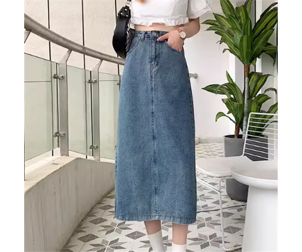 シンプルで洗練されたデザインが大人可愛いミモレ丈のデニムスカート。