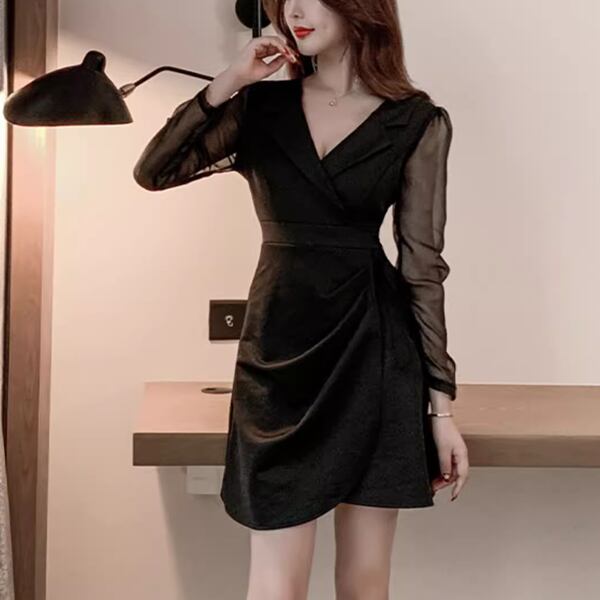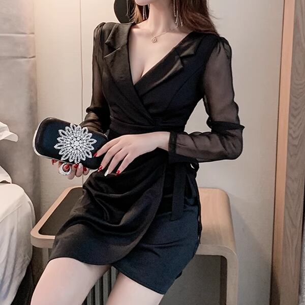 2カラー メッシュパッチワークドレス ナイトクラブドレス ワンピース イブニングドレス パーティードレス カラードレス ナイトドレス フォーマル ダンス クラブ ショート 膝上 長袖 スリム 細身 Aライン スーツ襟 レギュラースリーブ ステッチ メッシュ パッチワーク 痩身 ヒップカバー ローカット バックレスウエストマーク 透け感 シースルー きれいめ 大人可愛い 上品 おしゃれ かっこいい エレガント モダン クラシック 清楚 女性らしい ホテル レストラン 会食 シーズンレス ラウンジ