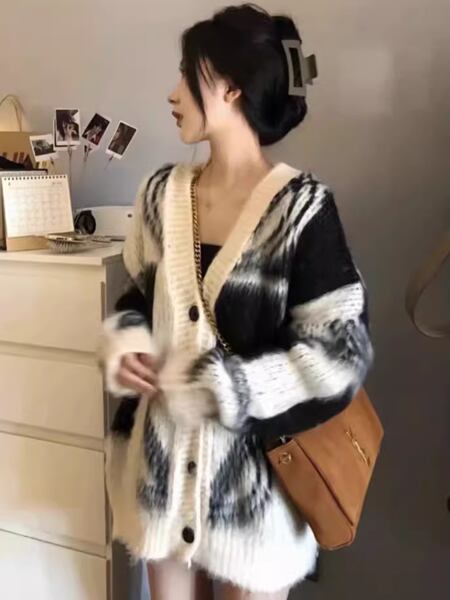 モヘア素材の暖かく柔らかなセータージャケット。コントラストカラーがおしゃれなアクセントになっています。Vネックデザインが女性らしいネックラインを演出。ニットカーディガンとして重宝し、様々なスタイルに合わせやすい一着です。