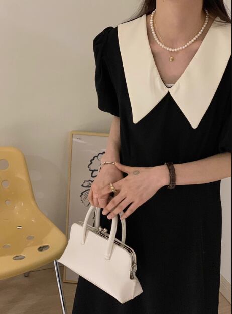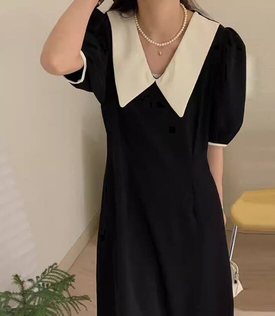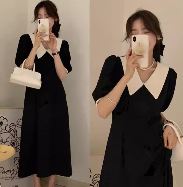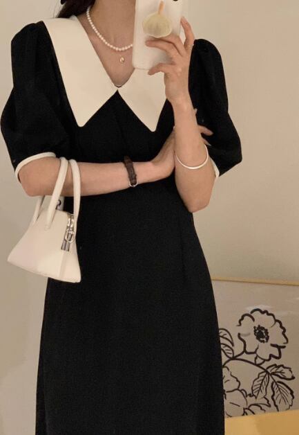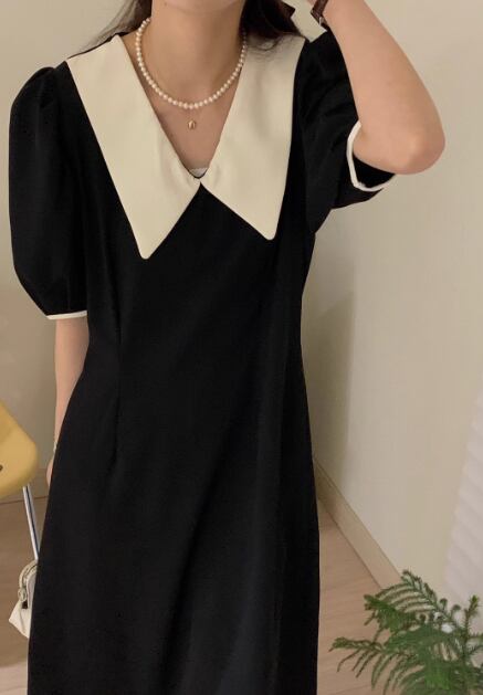 レディース ワンピース プルオーバー ロング 半袖 パフスリーブ 襟付き ビッグカラー フェミニン ハイウエスト 異国風 かわいい 大人可愛い きれいめ シンプル 上品 おしゃれ レトロ ガーリー エレガント キュート クラシカル カレッジ風 学生風 ナチュラル 知的 清潔感 シック 高級感 優しい 穏やか 無地 夏 10代 20代 学生 デート お出かけ 韓国 普段使い 清楚 フリーサイズ ブラック