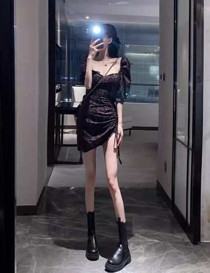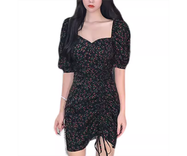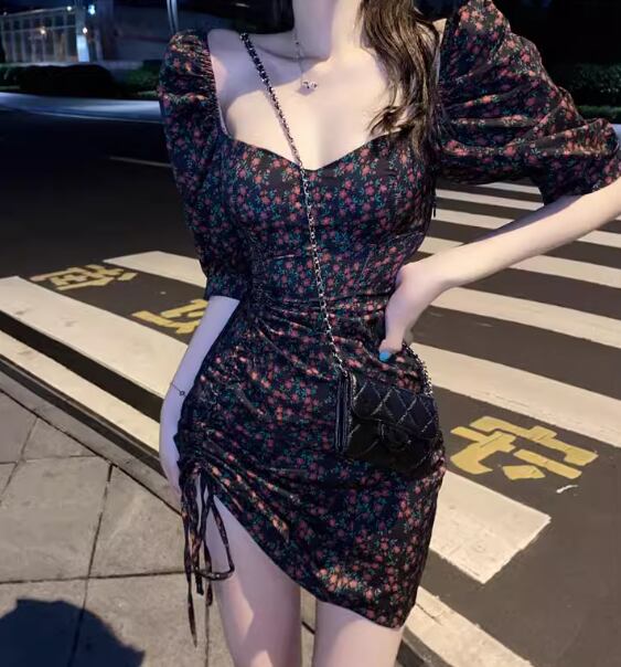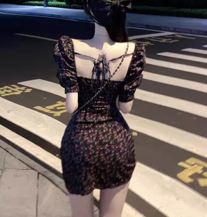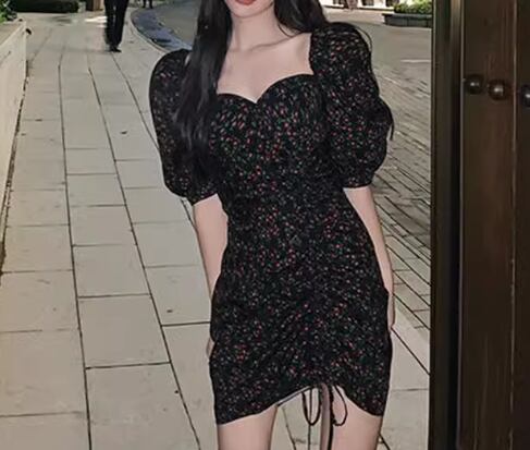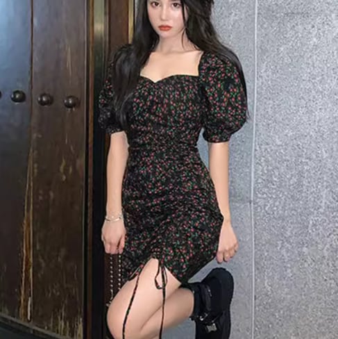 レディース ワンピース プルオーバー ミニ ショート 半袖 パフスリーブ スクエアネック タイト スリム 細身 フェミニン シャーリング リボン ハイウエスト かわいい 大人可愛い きれいめ おしゃれ かっこいい こなれ感 ガーリー クール ラグジュアリー セクシー 花柄 フラワー プリント 小花柄 夏 10代 20代 学生 デート お出かけ 普段使い S M L XL 大きいサイズ 小さめ フィット ブラック