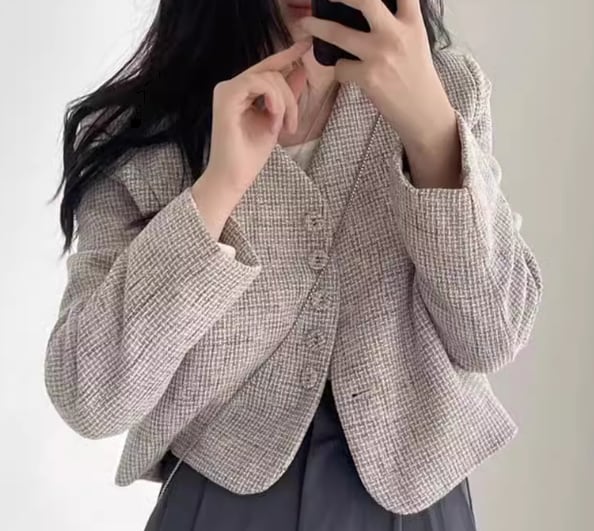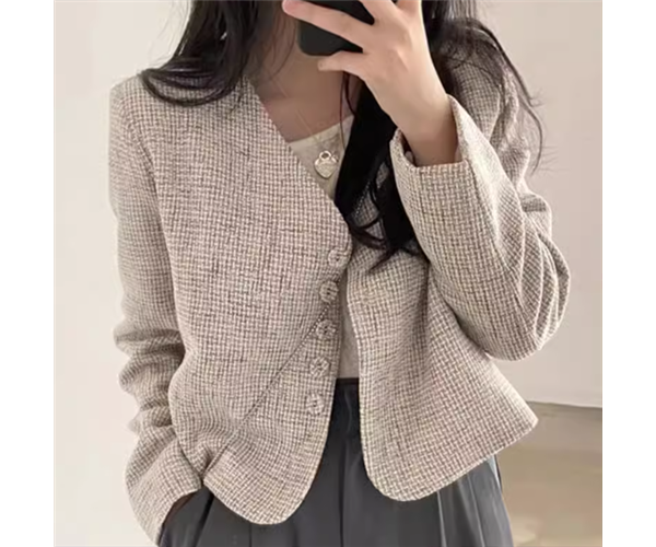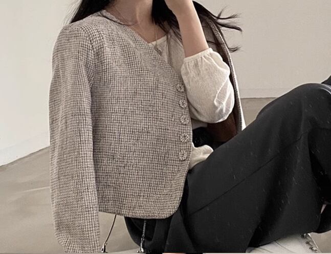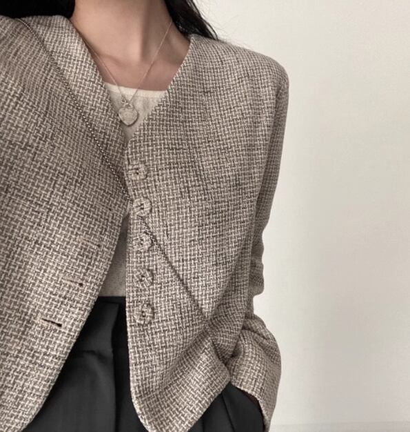 レディース ジャケット コート アウター 上着 ウール ノーカラーコート ノーカラージャケット ショート 長袖 Vネック 襟なし ノーカラー フェミニン 前開き 異国風 ボタン かわいい 大人可愛い きれいめ シンプル カジュアル 上品 おしゃれ かっこいい レトロ こなれ感 ボーイッシュ クール エレガント チェック 春 秋 冬 ママ OL デート お出かけ 韓国 普段使い 着回し フリーサイズ グレー