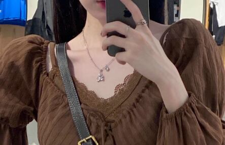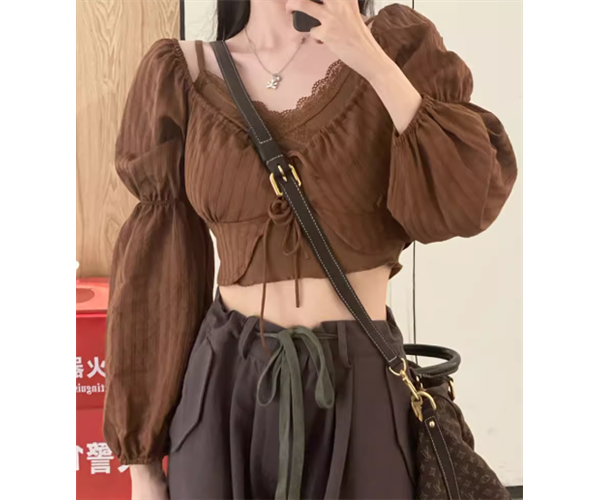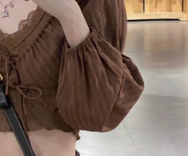 二点セット ツーピース レディース トップス カットソー プルオーバー キャミソール アンサンブル インナー ショート クロップド丈 長袖 ボリューム袖 ランタンスリーブ Vネック スリム 細身 フェミニン レース フリル リボン かわいい シンプル カジュアル おしゃれ レトロ こなれ感 ガーリー 無地 春 10代 20代 学生 デート お出かけ 重ね着 普段使い 着回し レイヤード トレンド 流行 フリーサイズ 小さめ ブラウン