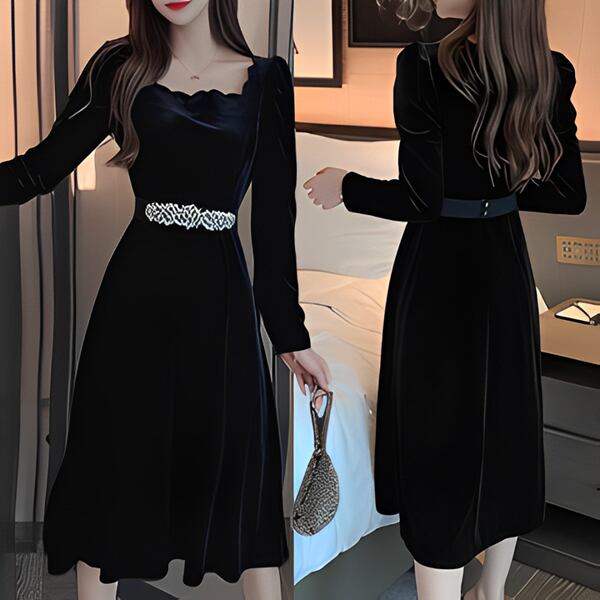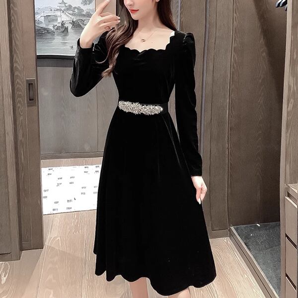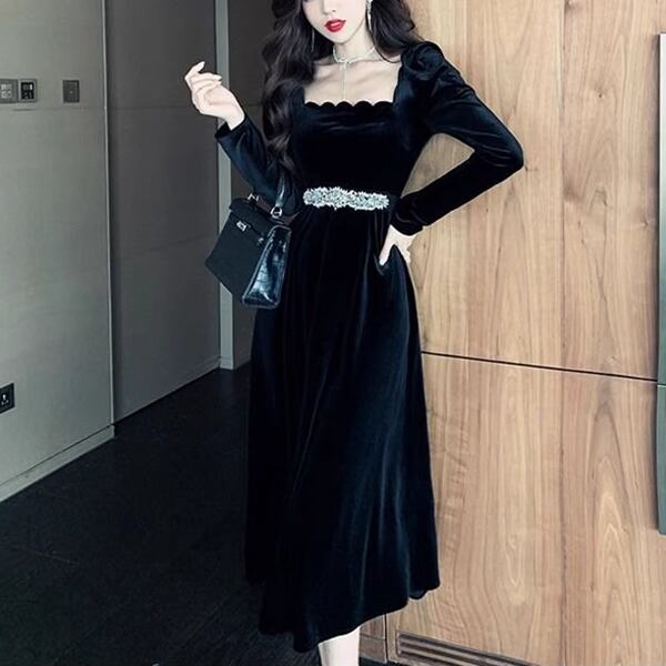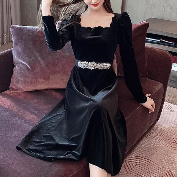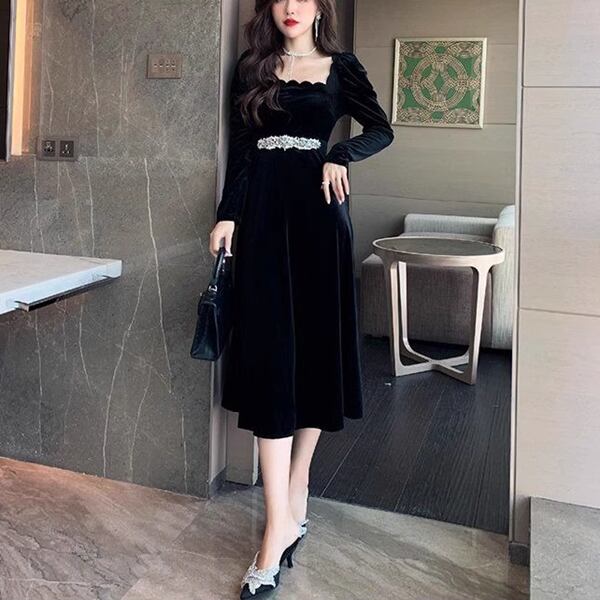 ヘップバーンスタイルゴールドベルベットドレス レディース ワンピース ドレス ロング 長袖 バルーン袖 プリンセススリーブ スクエアネック 細身 Aライン ベルト ウエストマーク ハイウエスト ビーズ ベルベット きれいめ 上品 おしゃれ レトロ モード系 エレガント フォーマル 穏やか 無地 春 秋 20代 30代 お出かけ パーティー イベント レストラン 女子会 ホテル ショッピング コンサート 黒 ブラック 光沢