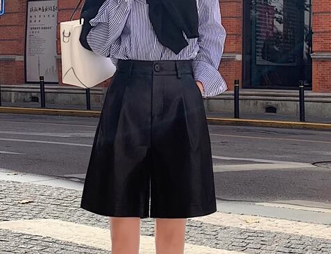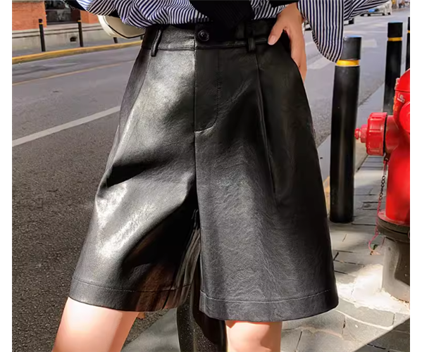 上品で落ち着いた色味とシンプルで洗練されたデザインが大人っぽい膝丈のレザーパンツ。